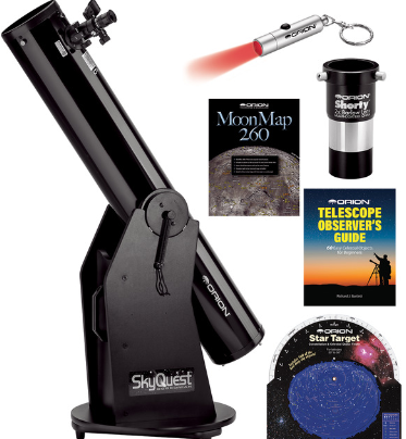The Orion SkyQuest XT6 is an excellent choice for so many reasons. It is a Dobsonian mount design. This floor standing telescope is extremely simple to use and very stable. This combination of a low cost and stable mount combined with the larger 6” aperture mirror makes this, and other Dobsonian style scopes extremely popular with first time telescope buyers and experienced people alike. Note that the total weight is about 35 pounds, but it comes apart in two pieces and that makes it easier to handle.